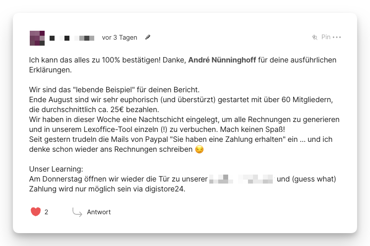 Viele, die neu mit Communi starten, schalten das integrierte Payment mit Stripe oder PayPal einfach frei, weil es so naheliegend ist. Das Problem zeigt sich oft erst Wochen oder Monate später: